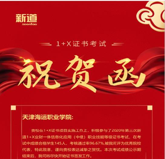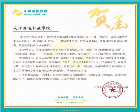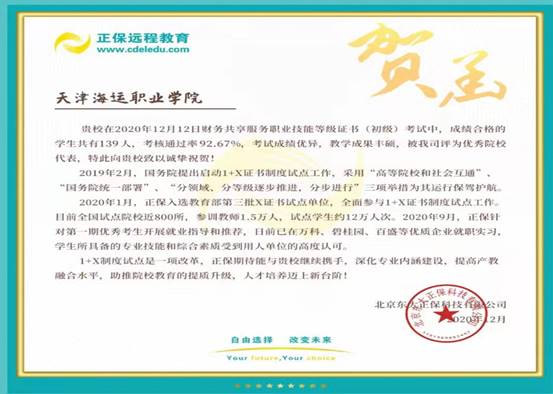 为贯彻落实教育部等部委《关于推进1+X证书制度试点方案》的通知,天津海运职业学院航运经济系作为天津市1+X金融财税类证书牵头院校,于2020年12月份完成了业财一体信息化等级证书(初、中级)和财务共享服务等级职业证书(初、中级)共计600人次的考评工作。此次考评工作取得了圆满的成功,学生考评通过率分别达到96.67%,92%和92.67%。